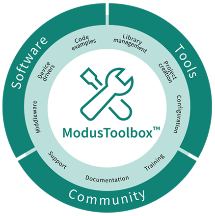 ModusToolbox™ software is a modern, extensible development environment supporting a wide range of Infineon microcontroller devices. Provided as collection of development tools, libraries, and embedded runtime assets, ModusToolbox is architected to provide a flexible and comprehensive development experience. Run-time software comprised of middleware, device drivers, and code examples is provided via an extensive collection of GitHub-hosted repositories. Development tools enable compiling, rogramming, and debugging, while directly interfacing with the available run-time software repositories.